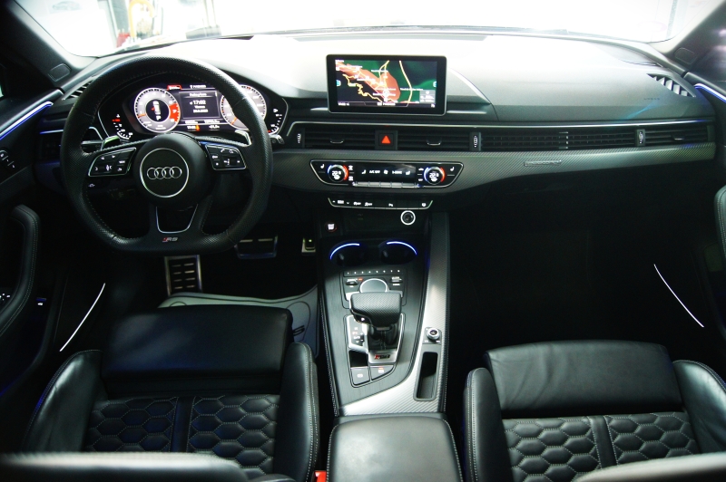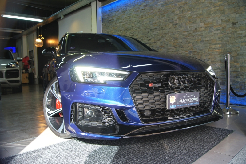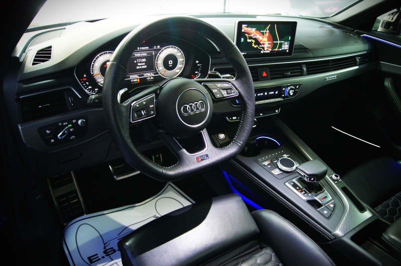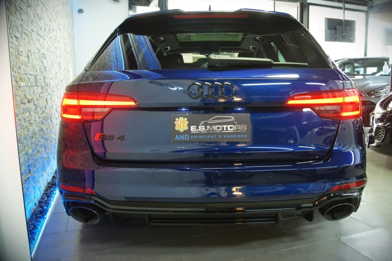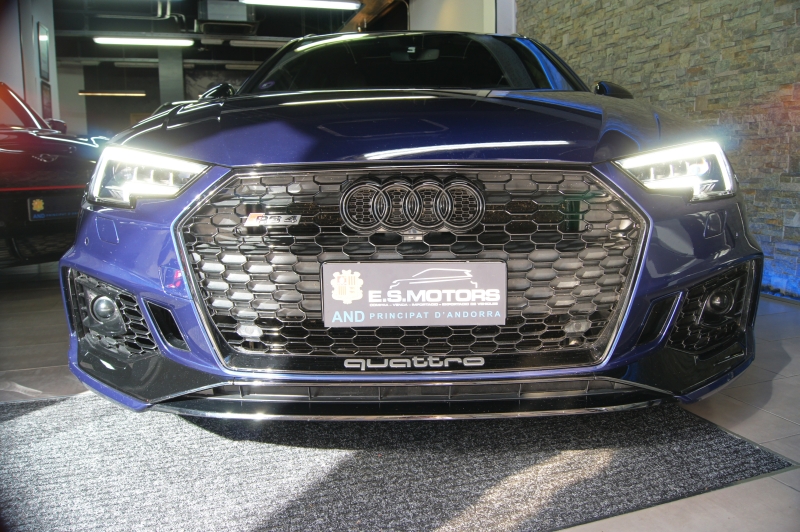 Extres: Sostre panoràmic obert – Navegador GPS - Climatització 3 zones - Vidres elèctrics – Il·luminació interior ambiental LED amb canvi de color – Audi Phone Box (Carregador telèfon inalàmbric) – Radio digital DAB – 2 lectors USB - Bluetooth - Color interior en cuir negre – Logotips RS als seients - Seients elèctrics – Seient conductor amb memòria - Seients amb funció massatge - Seients calefactables davanters i trasers - Isofix - Sensors pluja - Sensors llums – Fars full LED - Llums de dia LED - Llandes 20'' - Alarma - Ordinador d'abord - Vidres tintats amb protecció U.V. - Sensors aparcament davanters i trasers – Càmera d’aparcament - Recolzabraços central davanter i traser - Miralls electrocròmics - Retrovisors elèctrics - Retrovisors plegables – Volant multifuncions - Cruise control adaptatiu - Leves al volant - Suspensió adaptativa - Enllumenat de direcció - 4 tipus de conducció - Portó maleter elèctric – Portó maleter amb sensor d’obertura - Keyless&Go (obertura i arrencada sense clau) - Control per veu – Assistent col·lisió – Assistent conducció – Fre d’estacionament elèctric – Trucada d’emergència – Control pressió de neumàtics – Assistent actiu direcció – Start-Stop – Kit primers auxilis al maleter – Logotip RS4 retroil·luminat a les estriveres – Virtual Cockpit – Audi Hold Assist – Pinces de fre en vermell RS – Logotips AUDI exteriors en negre brillant – Sortida d’escapament Sport RS – Retrovisors en contrast negre – Acabats interiors en alumini tipus 3D – Enganxall de remolc elèctric – Head Up Display...