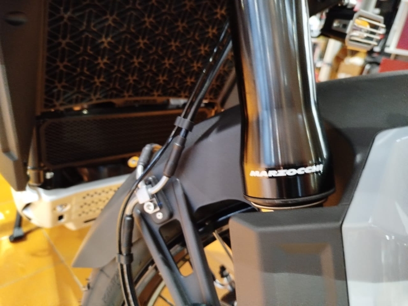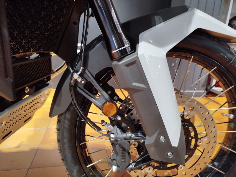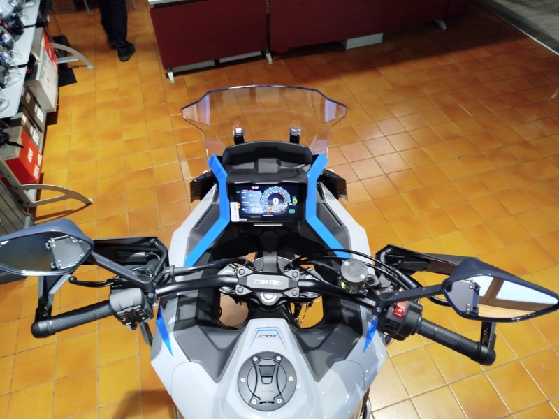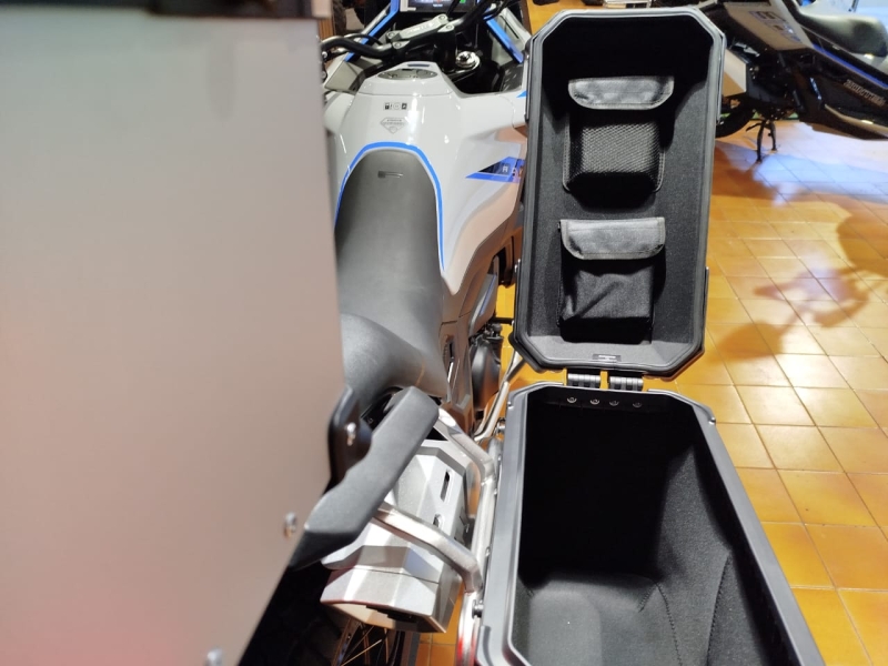Càmera davantera y darrera en Full HD amb 128 GB de memòria interna, parabrises amb ajustament elèctric, llums de gir, punys calefactables, control de pressió y temperatura de neumàtics, bateria de liti, puntera de canvi articulada, paramans, cavallet central y un pràctic compartiment lateral portaobjectes.