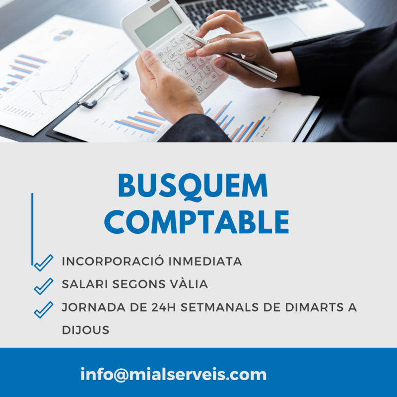 Busquem un/a comptable amb experiència en tasques administratives per incorporar-se a l’equip d’una gestoria. La persona seleccionada s’encarregarà de la gestió comptable diària i del suport administratiu relacionat amb l’àrea financera.