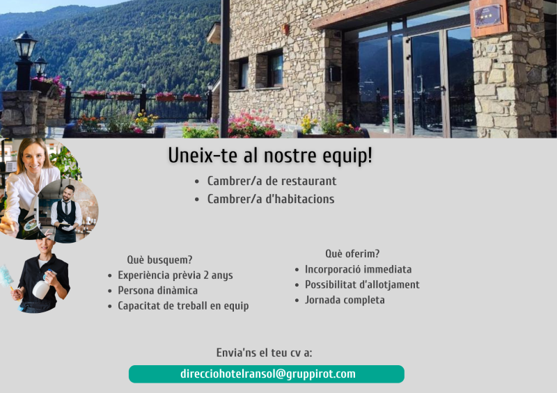 HOTEL RANSOL Empresa familiar andorrana busca camarero de restaurante y pisos para el Hotel Ransol ***. Experiencia: Mínimo 2 años Capacidad organizativa y trabajo en equipo. OFRECEMOS: Buenas condiciones de trabajo. Los interesados enviar un correo electrónico a: direcciohotelransol@gruppirot.com